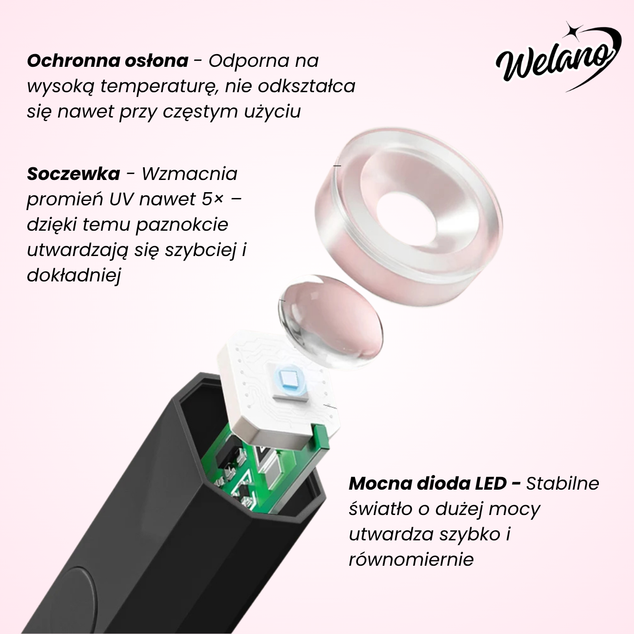 Zepsuty paznokieć tuż przed wyjściem? Odprysk hybrydy na wakacjach? Mini lampa UV uratuje Cię w każdej chwili – w domu, w aucie, na lotnisku. Mała, poręczna i zawsze gotowa, gdy najbardziej jej potrzebujesz.